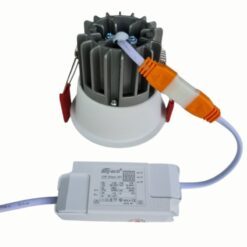- Bước 3: Đẩy tai lò xo của đèn hướng lên trên, đưa thân đèn vào lỗ khoét và thả nhẹ để tai lò xo kẹp chặt vào mặt trần.