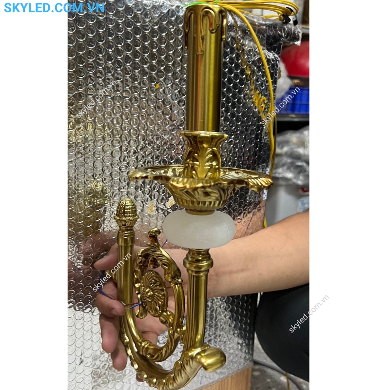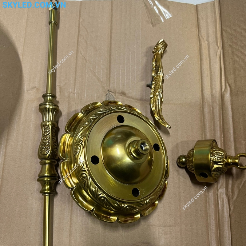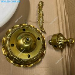 - Vật Liệu: Thân đèn được làm từ hợp kim vàng kết hợp với chao pha lê cao cấp, tạo nên vẻ đẹp sang trọng và độ bền cao.
