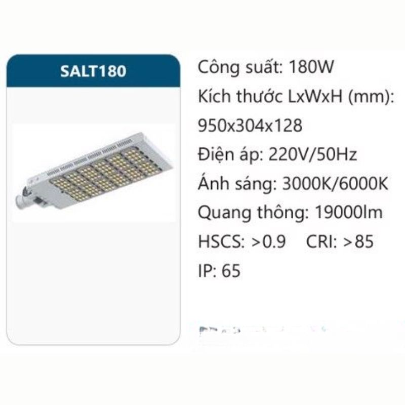 [Hình ảnh: Bản vẽ kỹ thuật chi tiết kích thước và sơ đồ mặt cắt của đèn đường LED SALT180]