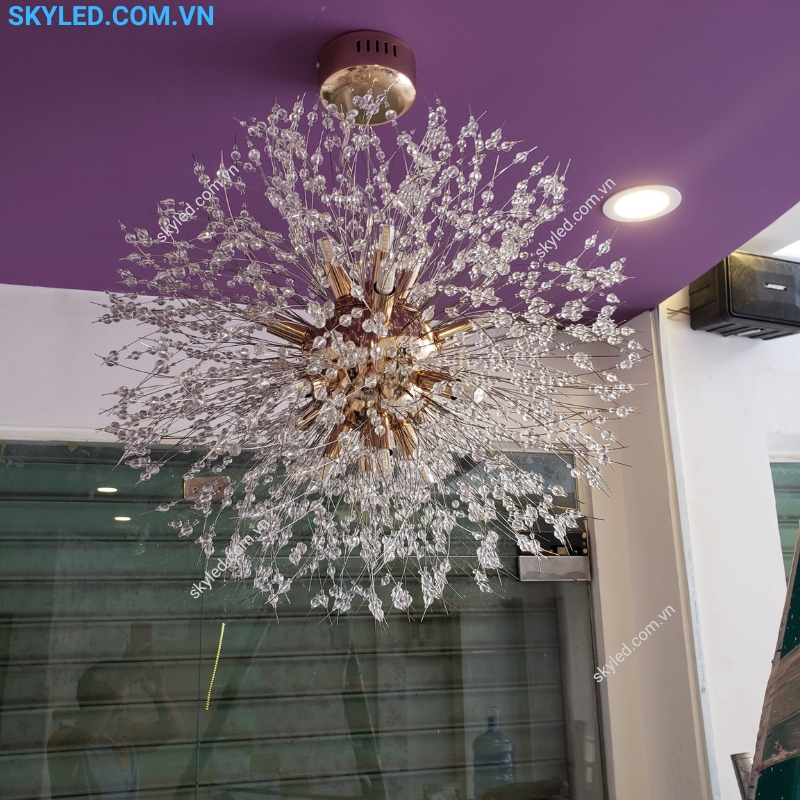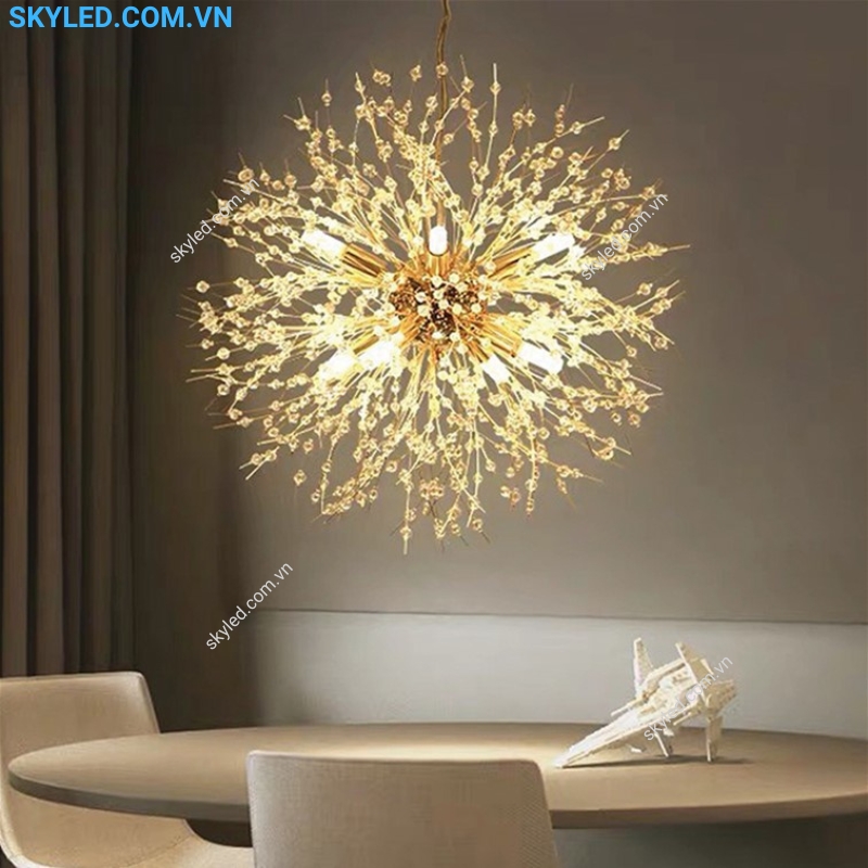 Sự kết hợp giữa kim loại bền bỉ và những hạt pha lê lấp lánh làm tăng thêm vẻ quý phái và sang trọng cho không gian. Đèn thả này không chỉ mang lại ánh sáng mà còn như một món đồ trang trí đắt giá, giúp nâng tầm thẩm mỹ cho bất kỳ không gian nào.