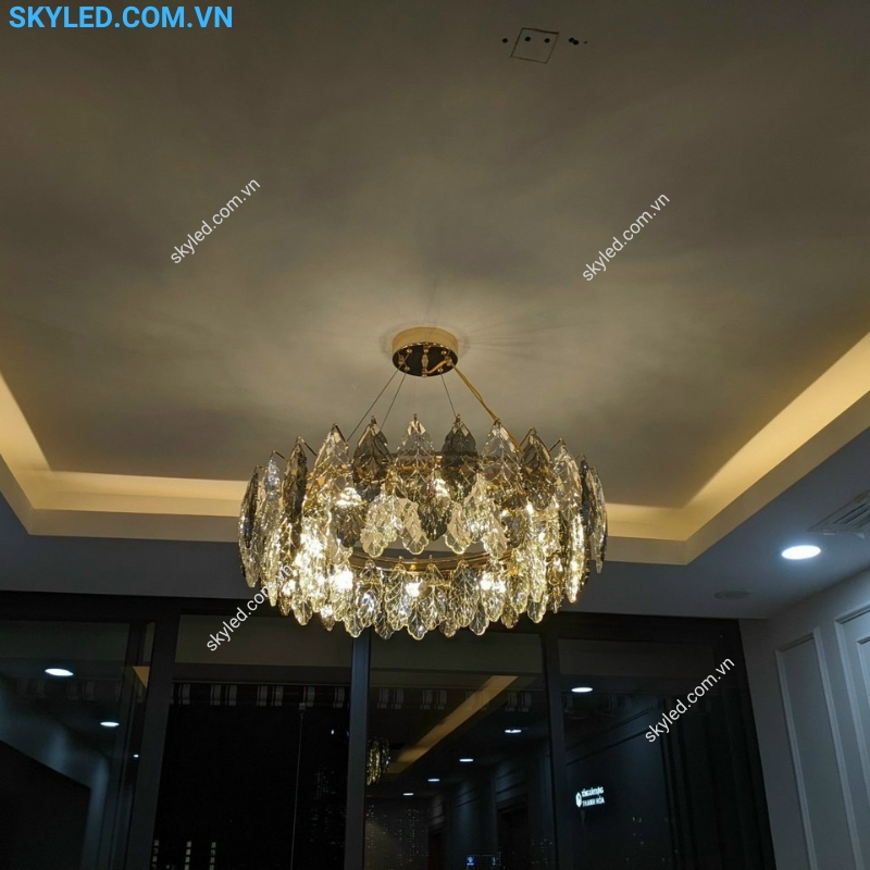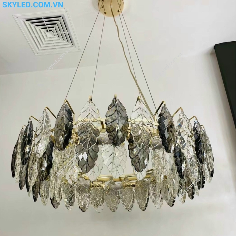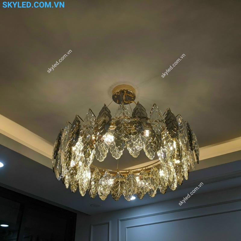 Sự kết hợp của chất liệu pha lê trong suốt với kim loại không chỉ tạo nên vẻ ngoài lấp lánh mà còn làm tăng thêm sự đẳng cấp cho không gian sống. Đặc biệt, thiết kế này giúp dễ dàng vệ sinh và bảo dưỡng, giữ cho đèn luôn trong trạng thái mới mẻ và sạch sẽ.
